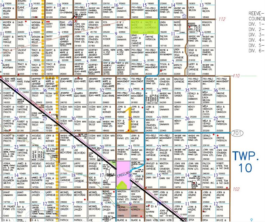 The offering includes a half section situated north of Creelman, along with an additional smaller parcel located on the south side of the Village of Creelman. The smaller parcel may be purchased on its own. The land is currently available to farm for the 2026 growing season.